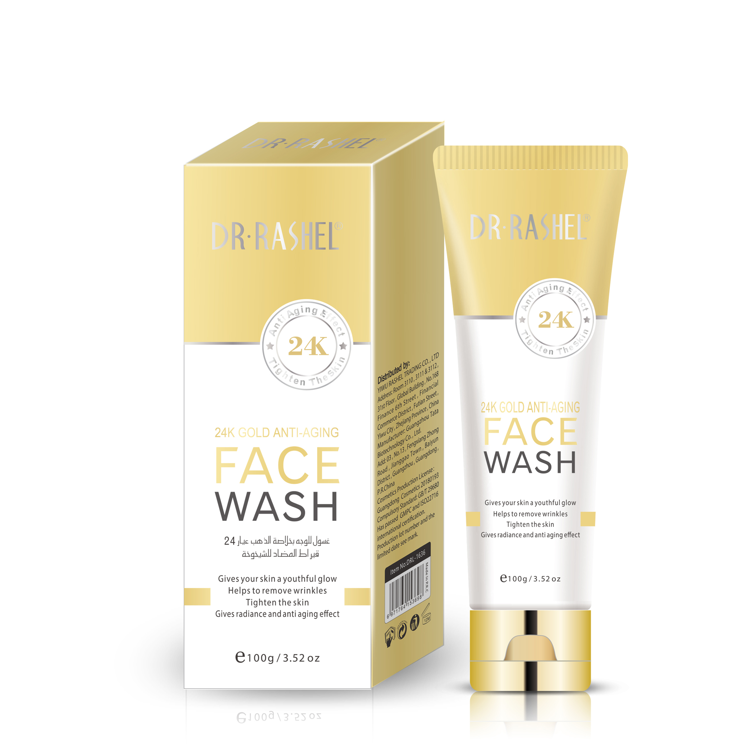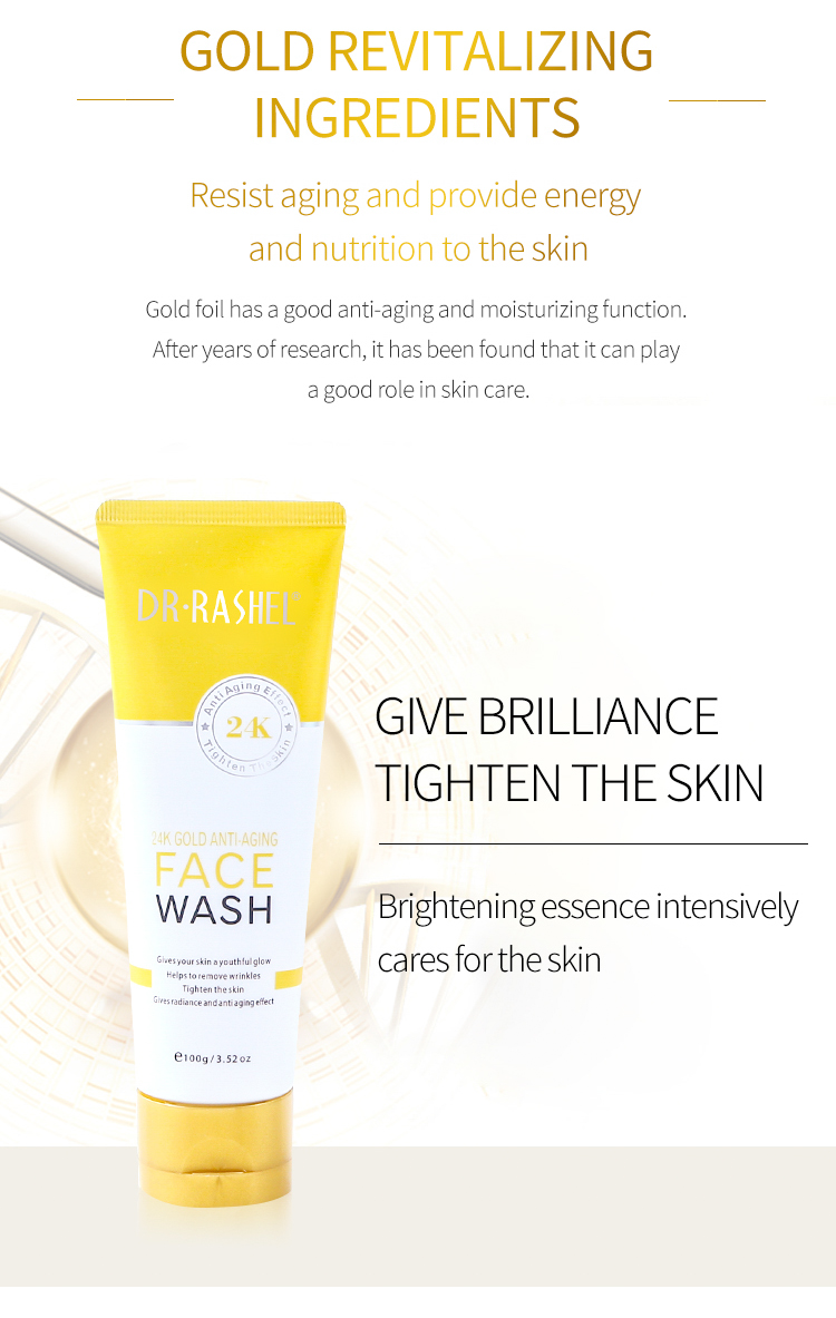 Dr. Rashel 24K Gold Anti-Aging Face Wash. Es un limpiador facial antienvejecimiento formulado con partículas de oro de 24K para ayudar a reducir las arrugas y las manchas oscuras. Contiene ingredientes orgánicos como té verde, manzanilla, aloe vera y lavanda para nutrir e hidratar la piel. Está diseñado para dar un brillo juvenil, ayudar a eliminar las arrugas, tensar la piel y proporcionar un efecto antienvejecimiento. Es adecuado para todo tipo de pieles y se puede usar diariamente. Se aplica masajeando el limpiador espumoso sobre la piel húmeda con pequeños movimientos circulares y luego enjuagando; se recomienda usarlo dos veces al día para obtener mejores resultados