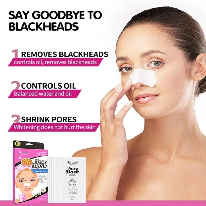 DISUNIE NOSE MASK CON ACIDO SALICÍLICO 10pcs Mascarilla para puntos negros de la nariz Elimina puntos negros, controla la grasa, resiste el acné y minimiza los poros. USO: Después de la limpieza, humedezca su nariz, coloque la superficie lisa de este producto sobre la nariz. Colóquelo sobre la nariz y déjelo actuar durante 15 minutos hasta que se seque y endurezca. Retírelo con cuidado y enjuáguelo. Aplique tónico.
