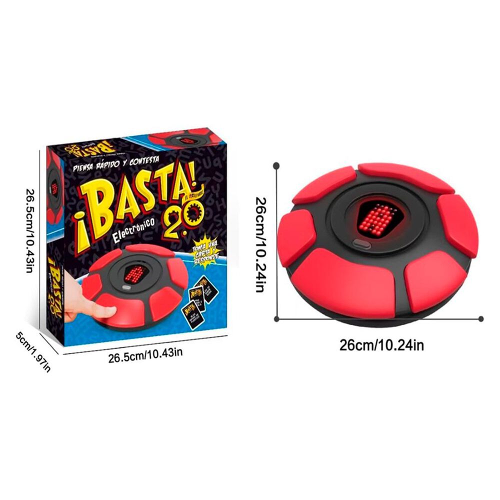 ¡Basta! 2.0 es un juego de agilidad mental y rapidez en el que los jugadores deben pensar rápido y contestar según las categorías que aparecen en las cartas. Incorpora un dispositivo electrónico que indica letras aleatorias, lo que añade dinamismo y evita discusiones.