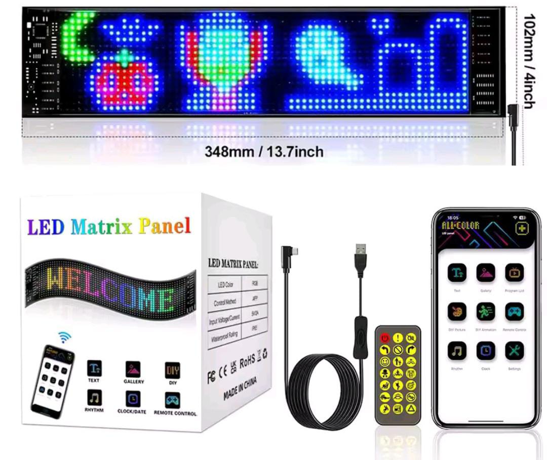 Este Panel LED Matrix es perfecto para mostrar mensajes, dibujos y animaciones desde tu vehículo, local o evento. Se controla fácilmente desde tu celular mediante una aplicación, permitiéndote cambiar textos, imágenes, efectos de ritmo y mucho más.